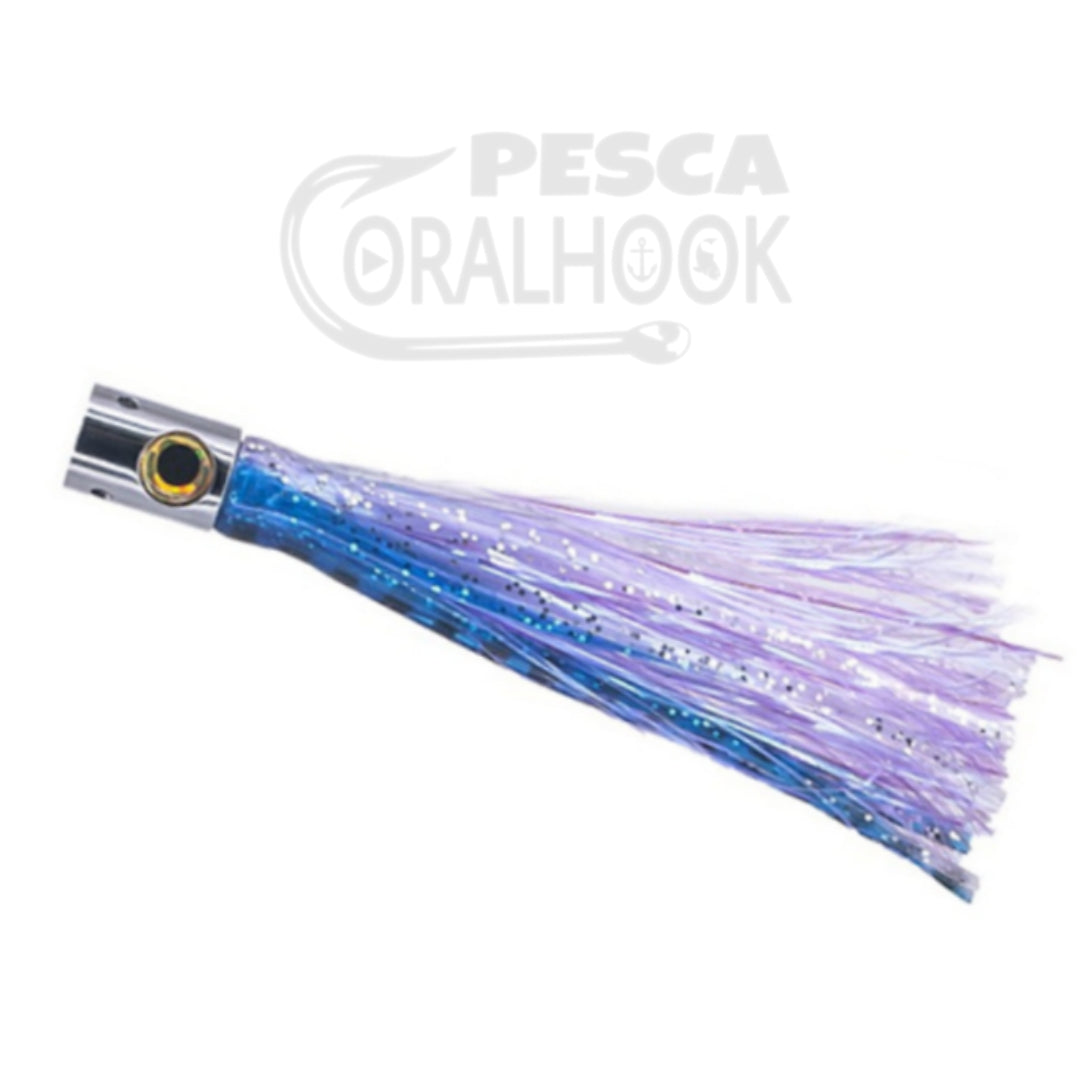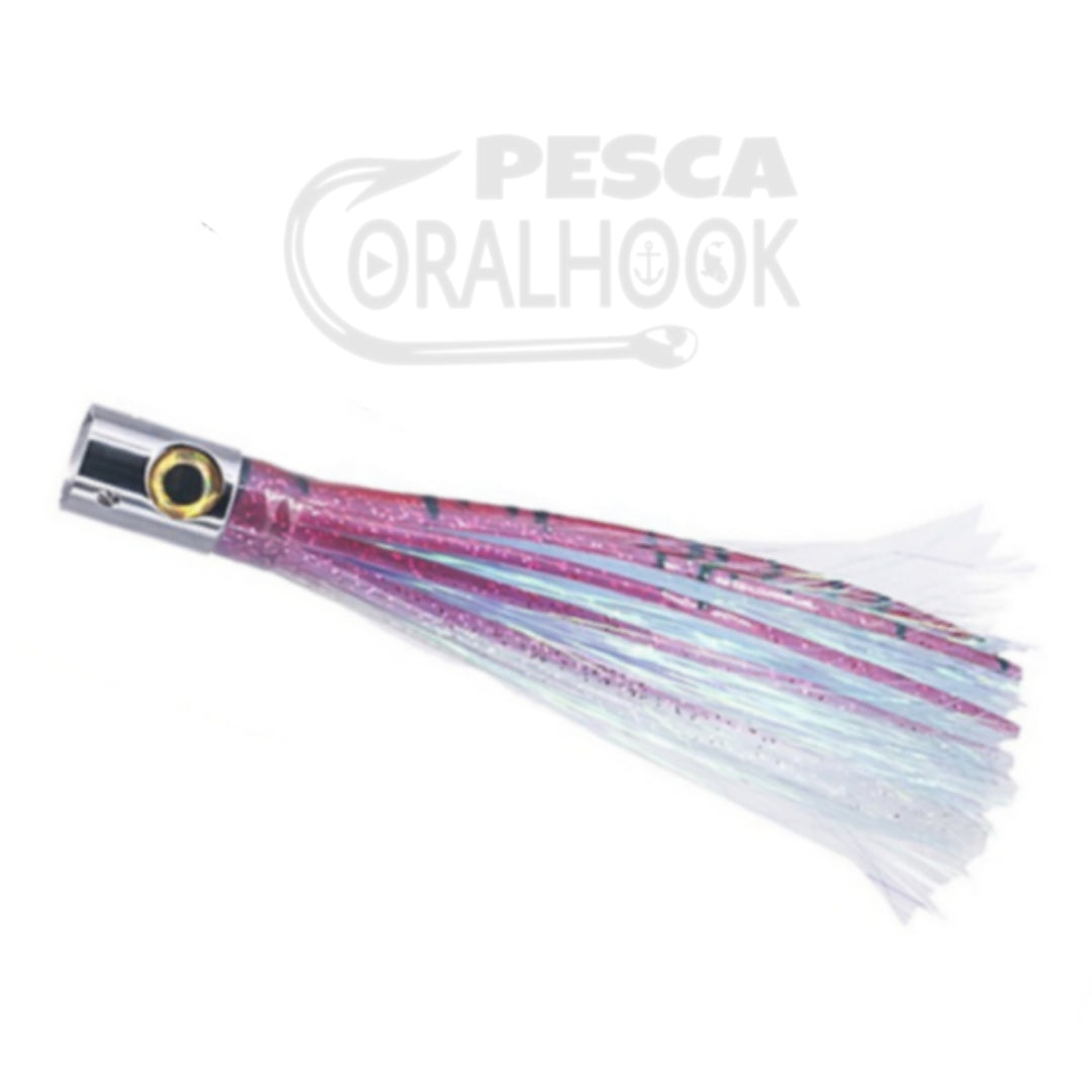 Carnada de 6.5" capaz de generar una estela importante manteniendo una flotabilidad por debajo de la superficie gracias a una cabeza de latón de 65gr. Fabricado con pulpo y vestido de Mylar para aumentar los destellos visuales.