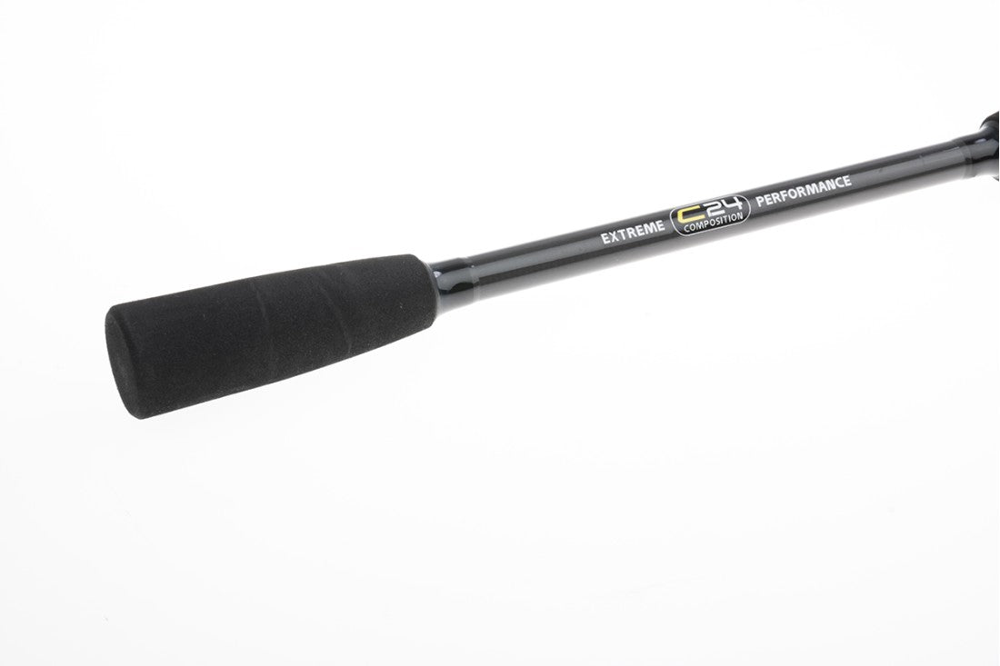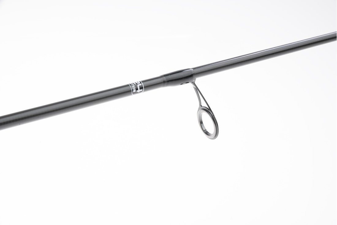 Blank tubular de composición de carbono. Montadas con anillas monopata y cerámicas tipo O-ring. Portacarretes tipo TVS. Funda de tela.