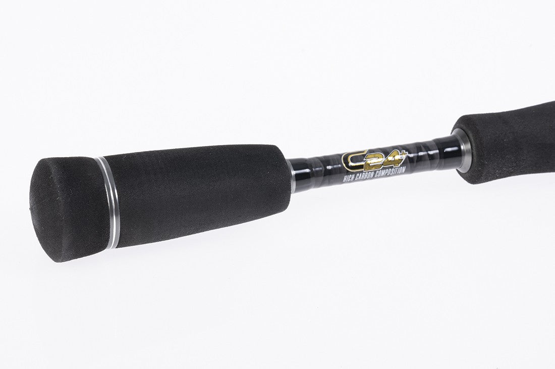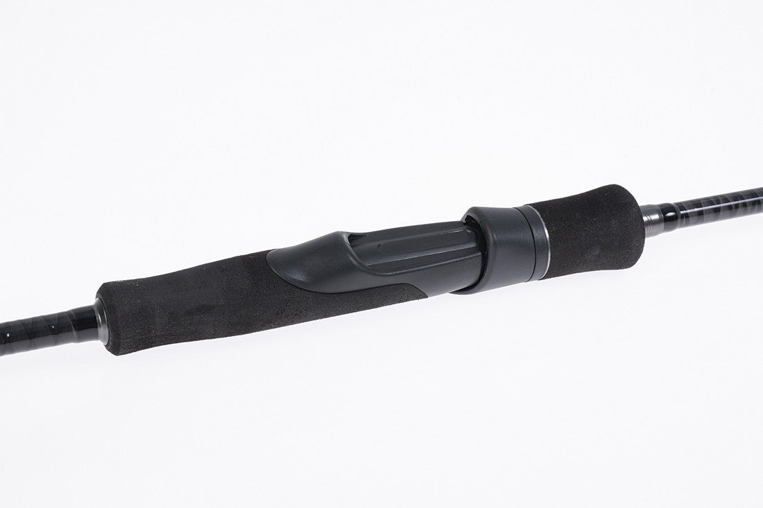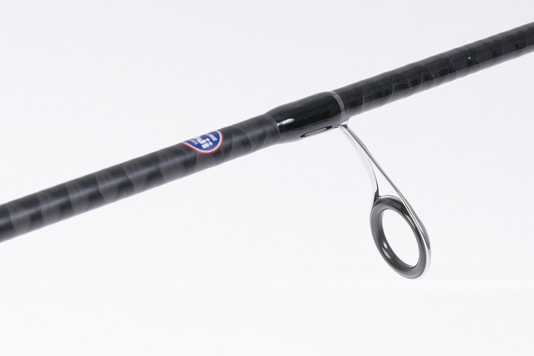 Puntera híbrida injertada de carbono macizo. Montada con anillas Fuji O Ring. Portacarrete tipo VSS+TVSK. Funda de tela.
