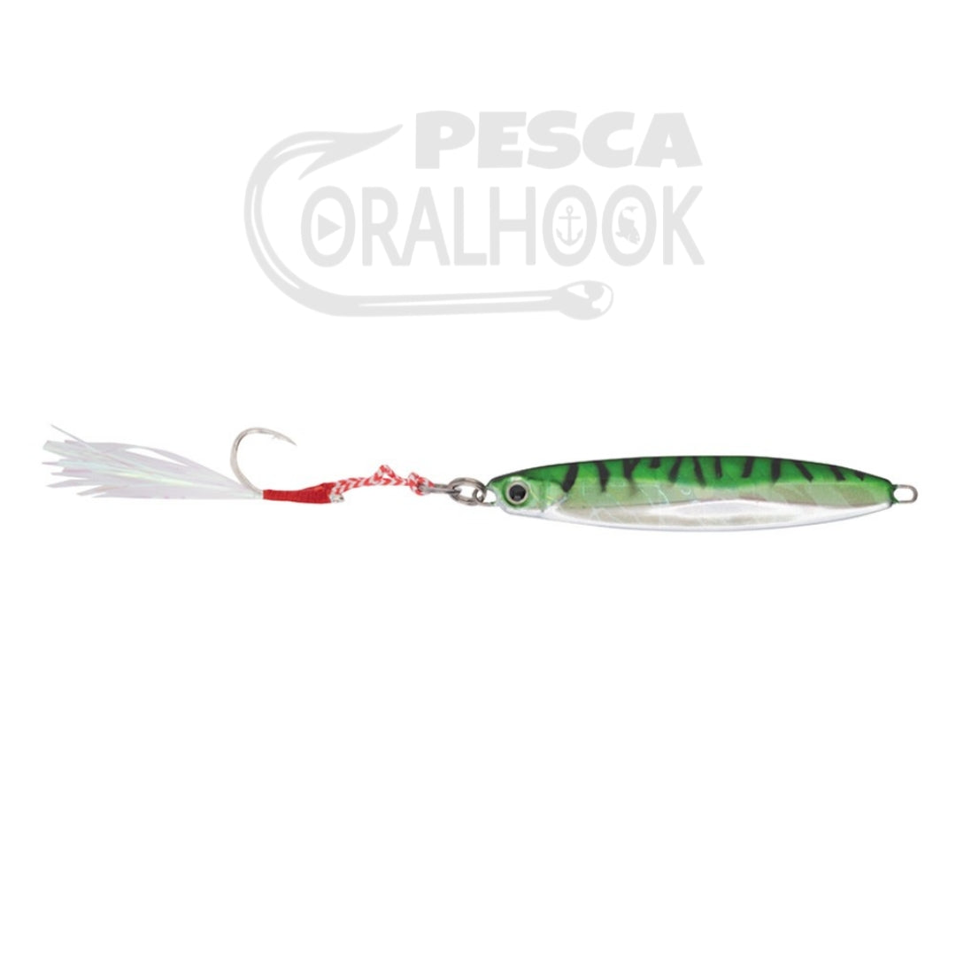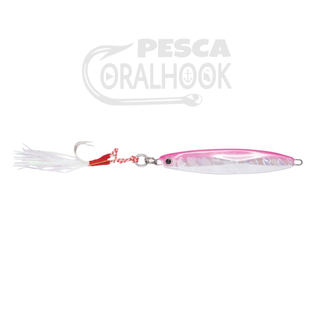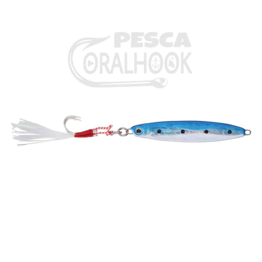 Pequeño jig con forma de pez, perfecto para pescas verticales o de casting. Gracias a sus espectaculares reflejos se convertirá en un gran atrayente de peces. Perfecto para prospecciones de zonas amplias.