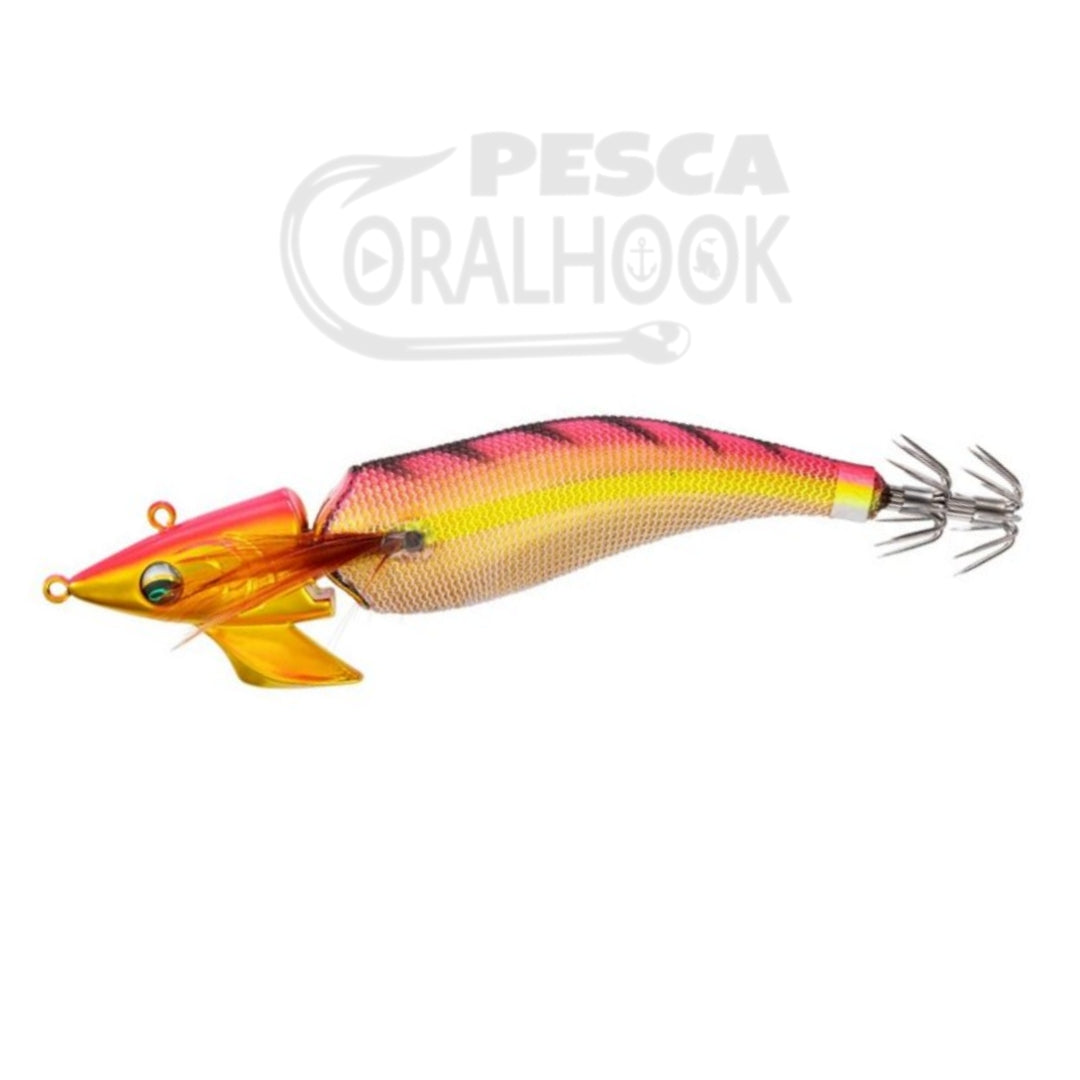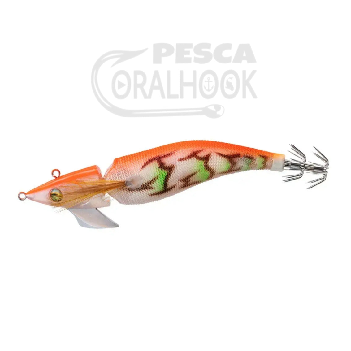 Jibionera articulada para la pesca de cefalópodos desde la orilla. La cabeza del señuelo tiene dos enganches para variar el nado en función de las condiciones de pesca. En la anilla situada en la cabeza, la acción vertical y el juego de la articulación son máximos para poder pescar lentamente una columna de agua y provocar un ataque incluso con movimientos mínimos. En la anilla superior es posible crear una acción «dardo» para provocar un ataque y explorar activamente una zona.