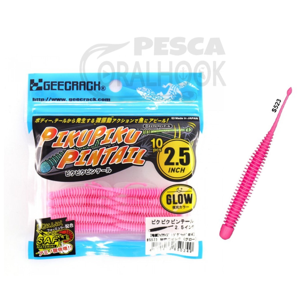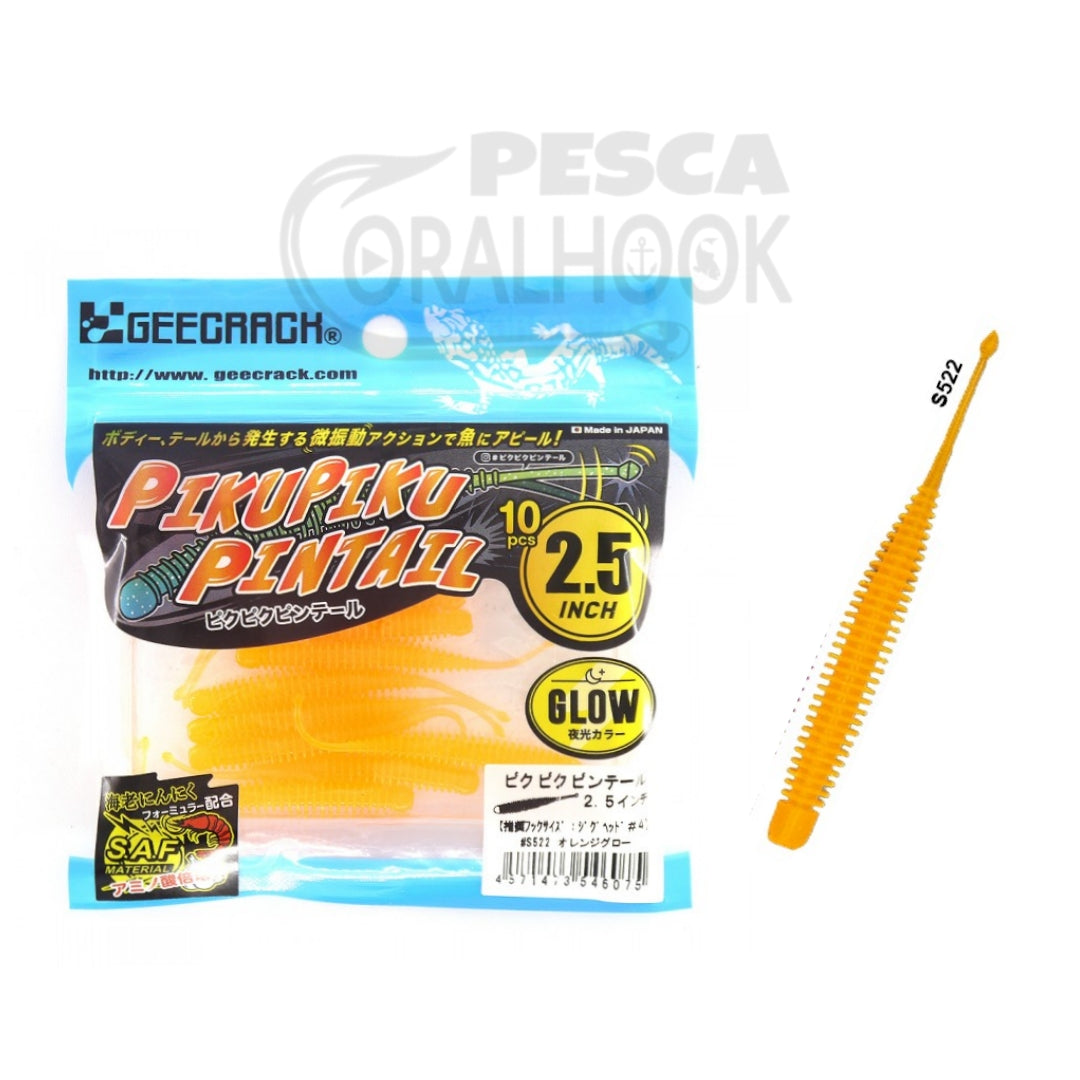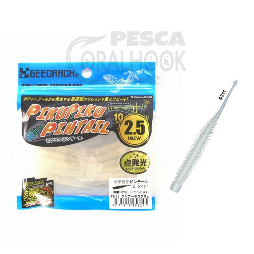 El Señuelo PikiPiku Pintail de Geecrack cuenta con cuerpo en forma de anillo de gusano, con buena retención de agua, y de ligeras ondulaciones, causadas por un pequeño bulto ó joroba en la punta de la cola, creando la máxima sensación de vida. El cuerpo es fácil de manejar, no demasiado voluminoso ni demasiado delgado. El material de tacto suave y resistente, es fácil engullir por los depredadores.