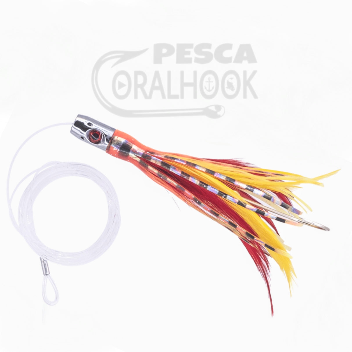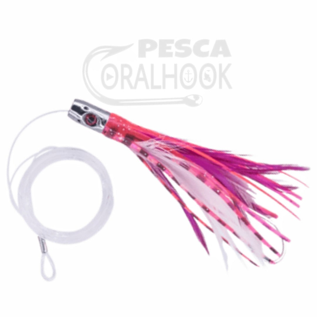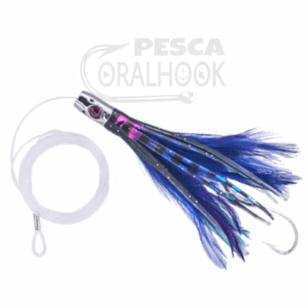 Un cebo de 4,5" con una cabeza de latón pulido para aumentar su efecto Flash. Un Jet aderezado con pluma y montado con anzuelo MUSTAD 3407DT ideal para atunes y llampugas.