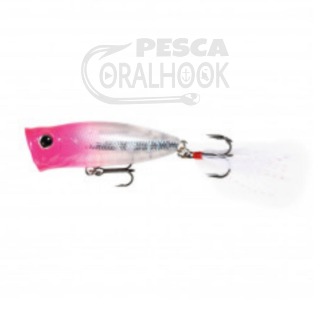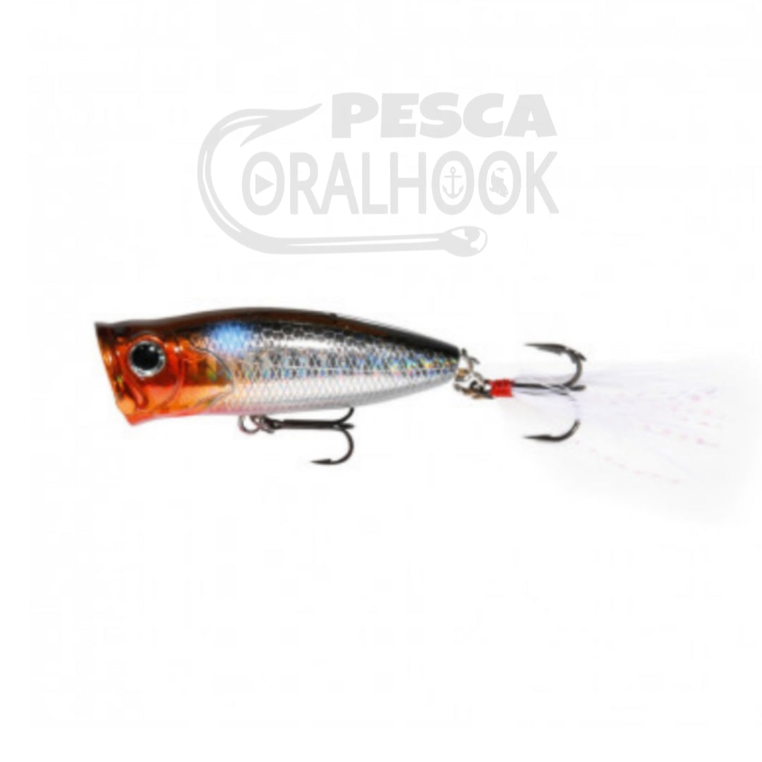 Este pequeño popper es capaz de mover una buena cantidad de agua en su chapoteo, atrayendo a los peces más lejanos. Su posición en reposo en el agua es prácticamente horizontal, con el culo ligeramente hundido y responde inmediatamente al jerking del pescador.