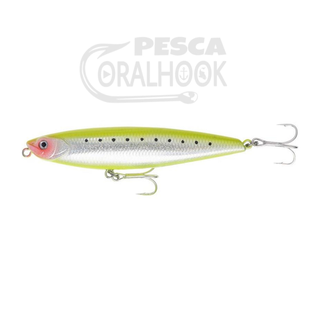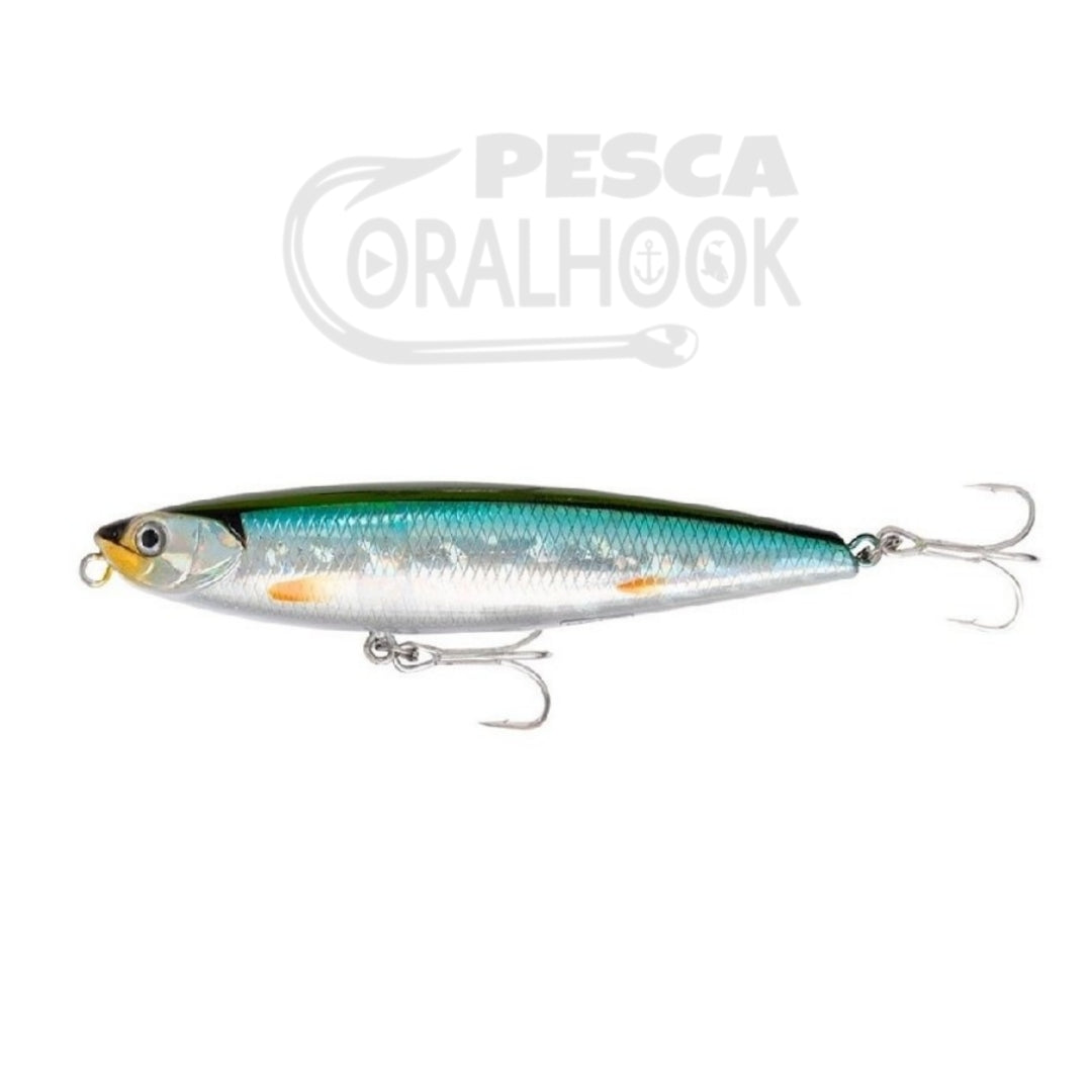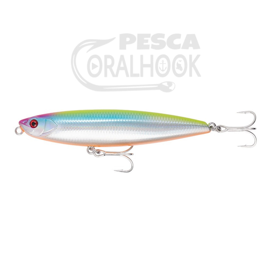 Paseante de superficie con un movimiento walking the dog muy facil de conseguir. Dotado de una gran capacidad de lance gracias a su sistema interno de transferencia de peso. Con sus ojos 3D realistas, las placas branquiales, las escamas y el excelente trabajo de pintura, este señuelo pronto se convertirá en el favorito de tu caja de pesca.