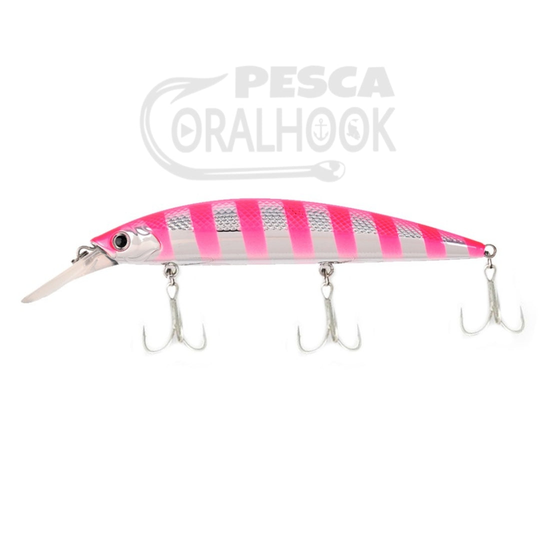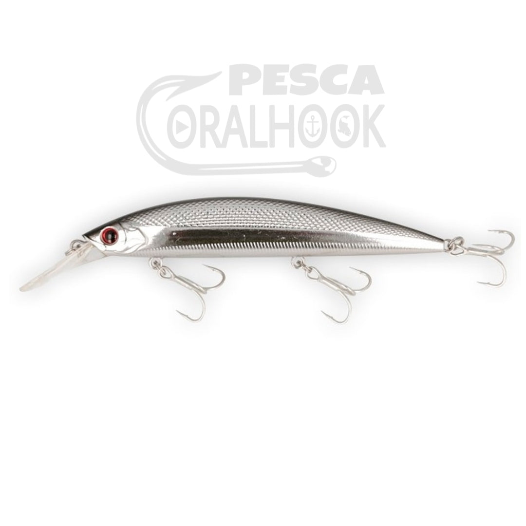Minnow sinking de gran peso específico y babero potente. Perfecto para pescar desde las rocas con altura ya que su agarre al agua es muy fuerte. Ideal cuando los peces están activos. En recogidas rápidas su marcado wobbling incluirá repentinos derrapes de descarga de presión enloqueciendo a los voraces depredadores.