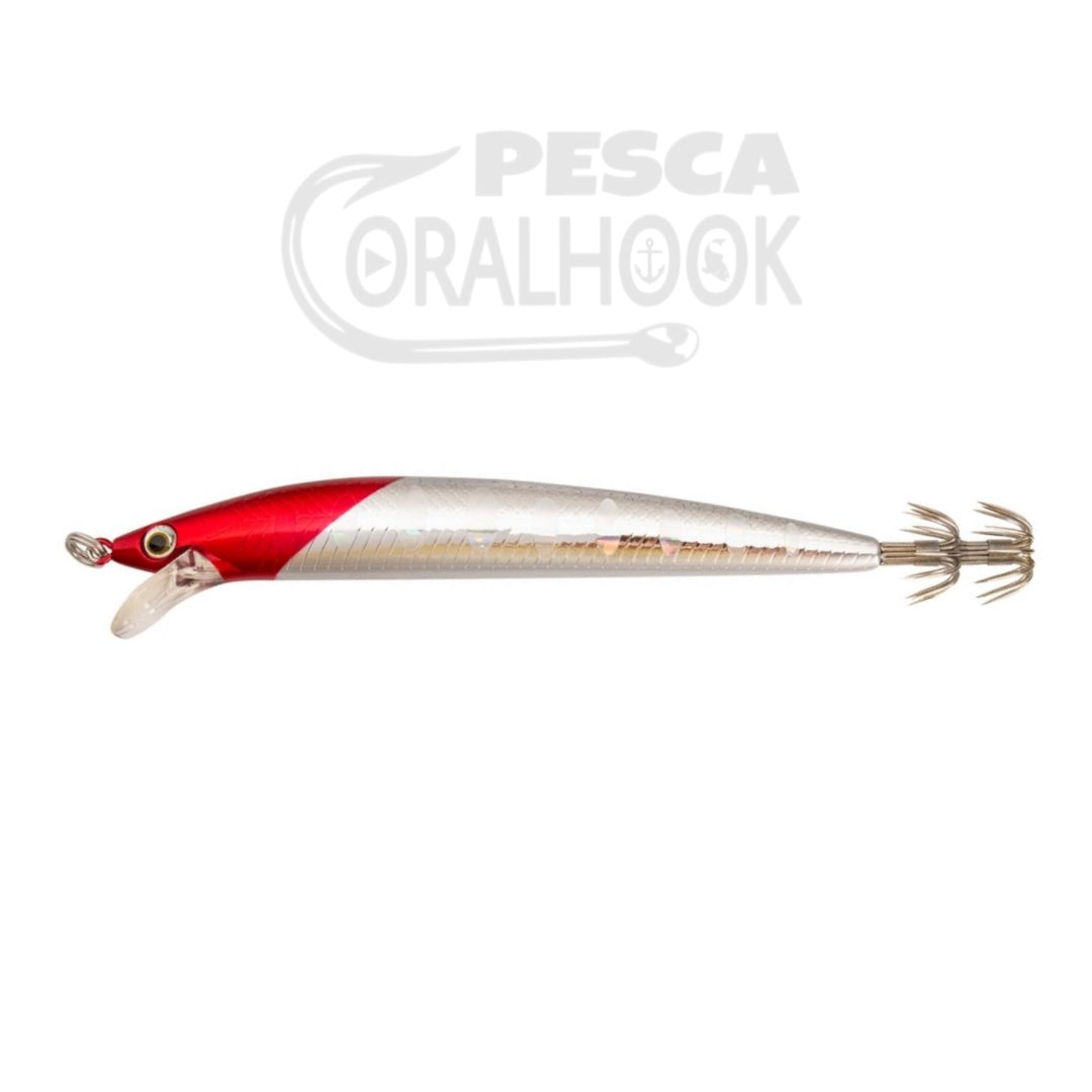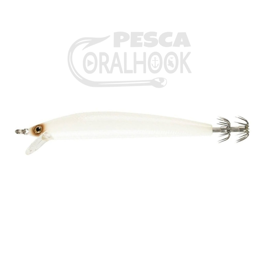 Señuelo Maria Squid Minnow, diseñado para hacer el curricán del calamar. Dispone de un babero que le permite navegar a velocidad de 1.5 nudos ideal para la pesca del calamar. Equipado con corona doble muy afilada.